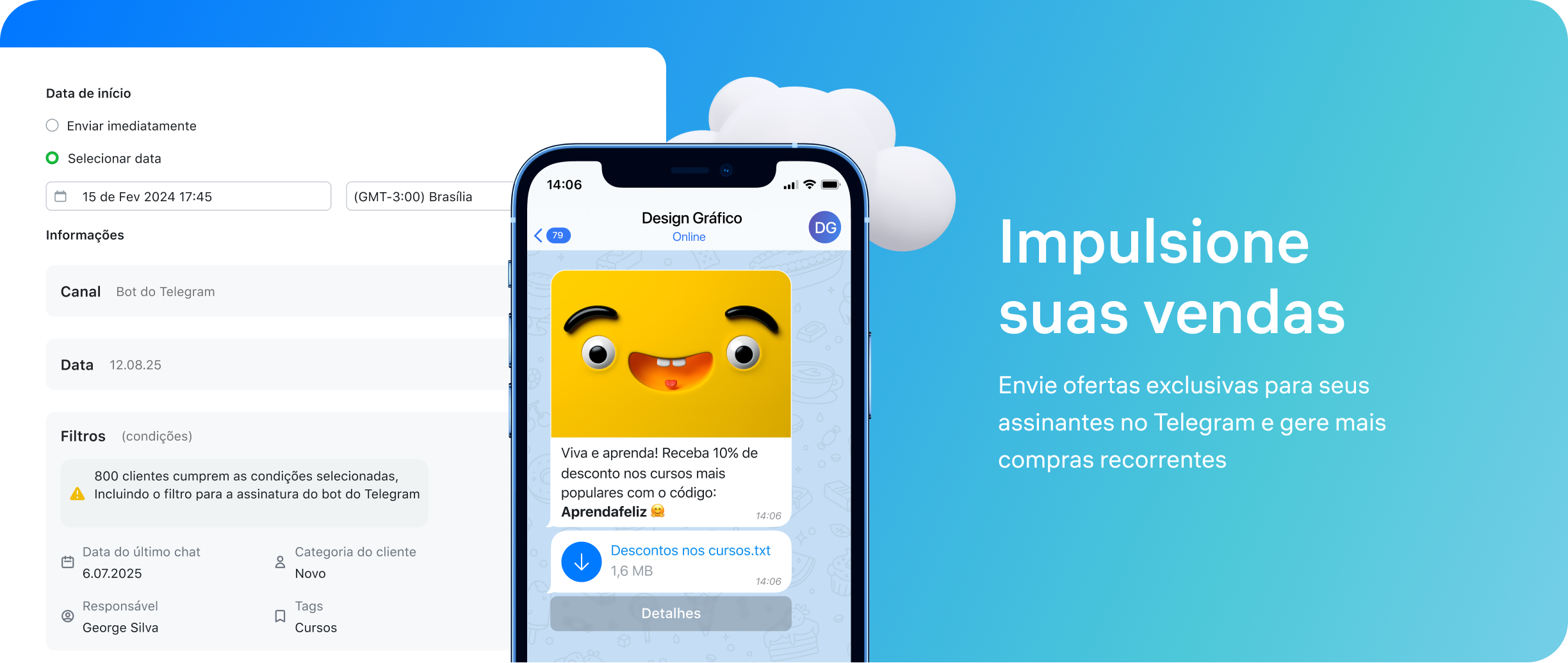 Envie campanhas para grupos de clientes segmentados por interesses, histórico de compras e comportamento.