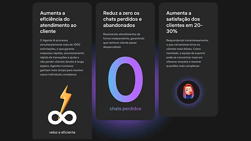 Com o agente resolvendo até 80% das demandas de forma autônoma, sua equipe foca no que realmente importa. Isso reduz o custo por atendimento e melhora a experiência do cliente com mais agilidade e consistência.