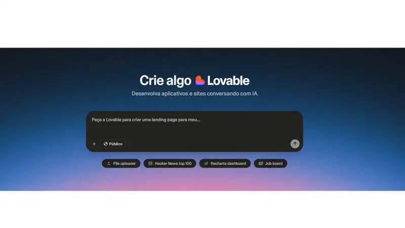 Para começar a nossa lista, vamos falar da Lovable, uma plataforma de IA para desenvolvimento de software que permite criar sites e aplicativos completos a partir de prompts em inglês ou português.