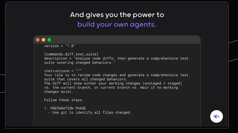 Os agente de IA da plataforma entendem padrões e práticas da sua empresa, garantindo que as sugestões estejam alinhadas com os objetivos e requisitos de cada projeto. A ferramenta ainda te da acesso a recursos como teste guiados por chat, análises de cobertura de código e documentação automatizada.