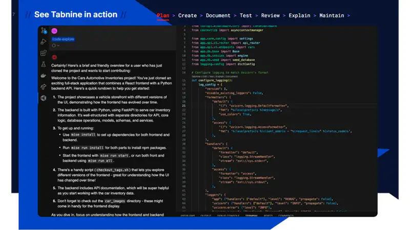 Continuando nossa lista, temos o Tabine, que utiliza uma IA treinada em bilhões de linhas de códigos para fazer sugestões contextuais de código com base nos padrões identificados em seu projeto, englobando desde a criação até a documentação, testes e revisão do código.