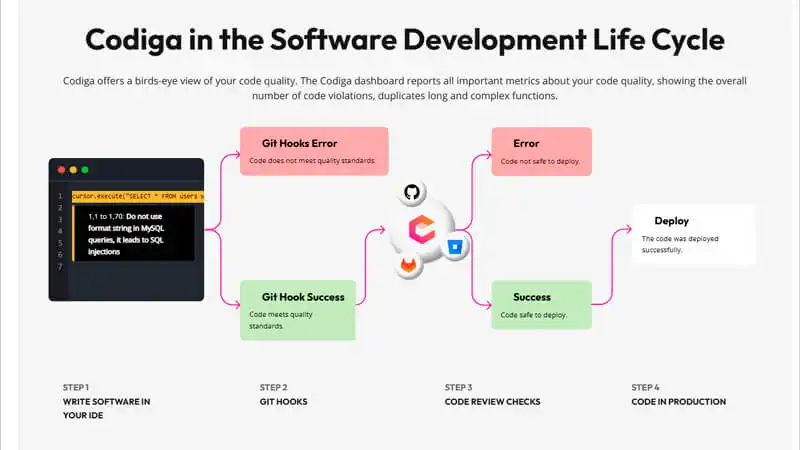 Voltada para melhorar a qualidade do código, o Codiga é uma ferramenta de análise estática que atua diretamente no seu IDE ou pipeline de CI/CD, identificando e corrigindo possíveis vulnerabilidade, problemas de segurança e violações de boas práticas em tempo real.