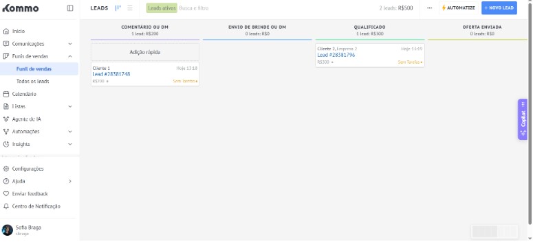 A Kommo é uma plataforma de CRM focada em vendas conversacionais, com forte integração com o WhatsApp e reconhecida como parceira da Meta. Ela permite capturar leads automaticamente, organizar contatos em funis de vendas e centralizar todas as conversas em uma caixa de entrada unificada.