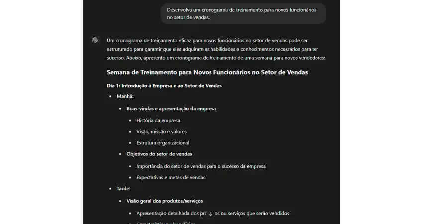 "Desenvolva um cronograma de treinamento para novos funcionários no setor de vendas."