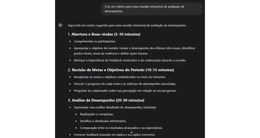 "Crie um roteiro para uma reunião trimestral de avaliação de desempenho."