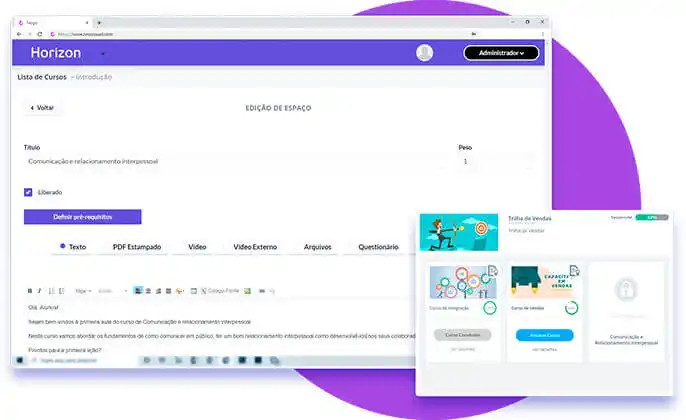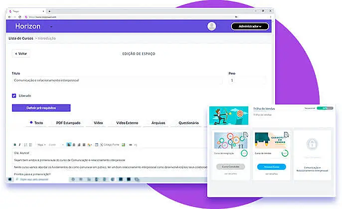 A plataforma aceita upload de vídeos, documentos de diversos formatos de arquivos e até aulas ao vivo. Além disso, possui integração com diversas plataformas de pagamento online.