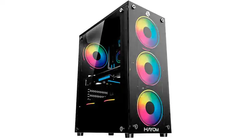 Este kit é composto por um gabinete Hayom GB1749 com 4 ventoinhas RGB e lateral de vidro, uma placa mãe A520M, um processador Ryzen 7 5700G de oito núcleos e 16GB de memória RAM DDR4 com 3200Mhz.