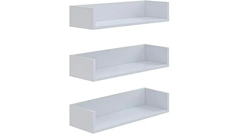 O próximo produto da nossa lista é um jogo com três prateleiras de madeira que possuem 60 centímetros de comprimento, 20 centímetros de profundidade e acabamentos laterais de 11.5 centímetros de altura.