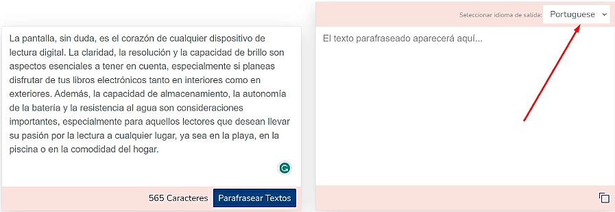 - Selecione a língua para o seu texto reformulado.