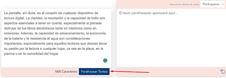 - Prima o botão "Parafrasear texto" para reescrever o texto em apenas alguns segundos.