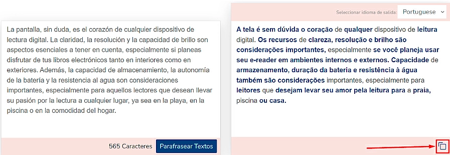 - O texto reescrito aparecerá na caixa do lado direito, copie o texto e cole-o no documento pretendido.