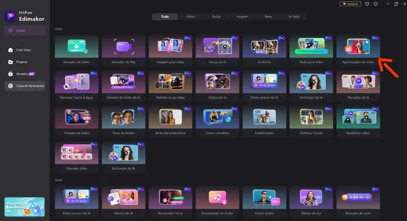 Em seguida, escolha a função Aprimorador de Vídeo. Essa ferramenta reúne os principais recursos para melhorar qualidade de imagem em vídeos, incluindo definição, estabilidade e correção visual.