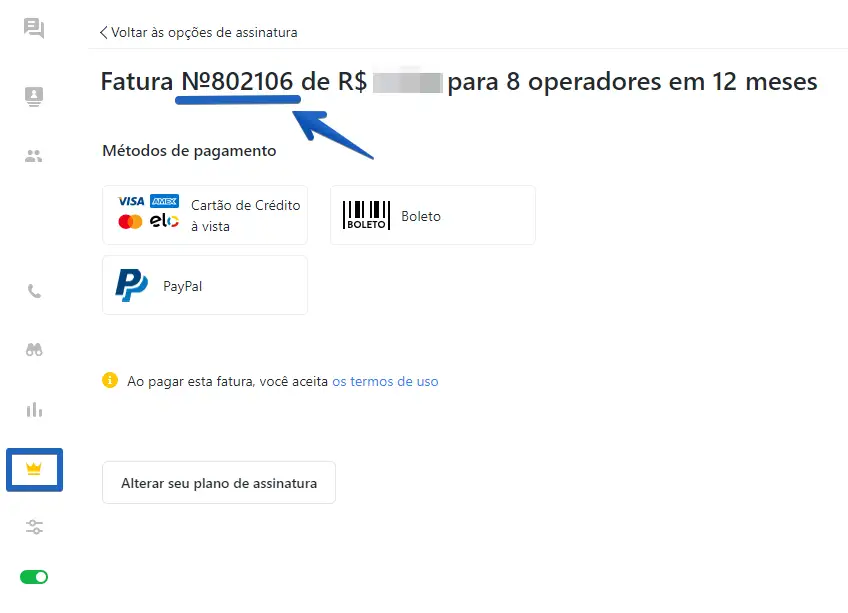 A primeira informação que você precisará é o número da sua fatura. Você pode encontrá-la no aplicativo JivoChat após gerar uma fatura para pagamento.