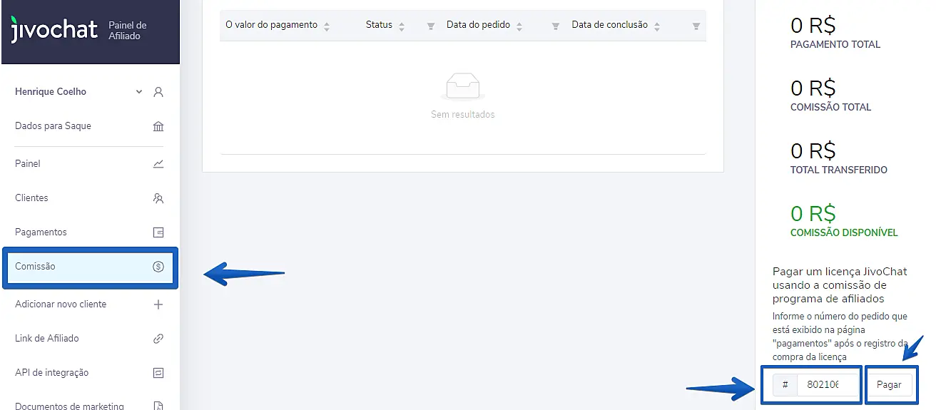 Como usar a comissão para pagar uma licença do JivoChat