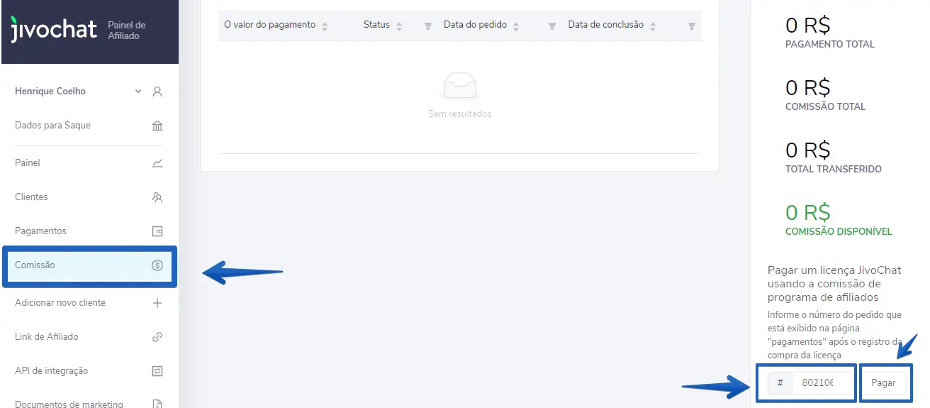 Dentro do painel, clique no menu "Comissão" ou "Pagamentos". Você encontrará a opção indicada abaixo em qualquer um destes menus.
