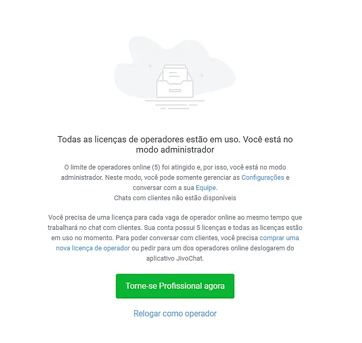 Caso um de seus operadores esteja tentando logar e você está ocupando uma licença da conta, deslogue do app JivoChat e aguarde até que seu operador faça o login. Após seu operador estar logado, pode fazer o login novamente com a sua conta. Você entrará automaticamente no Modo Admin, sem ocupar licenças de uso do chat.