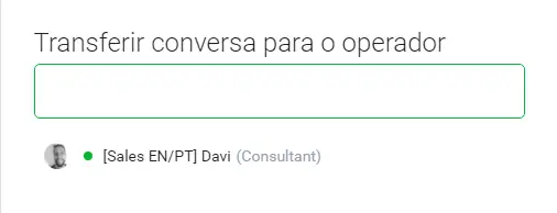 Transferir conversa. Você pode transferir uma conversa para um colega de outro departamento. Para fazer isso, clique em "Transferir conversa" e selecione um operador: