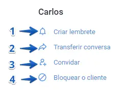 Criar lembrete. Você pode criar um lembrete dentro de conversas. Uma conversa com um lembrete adicionado irá aparecer em formato pop-up e poderá ser visualizada na seção "Conversas" no horário especificado dentro do lembrete. Você também pode deixar um comentário dentro do lembrete.