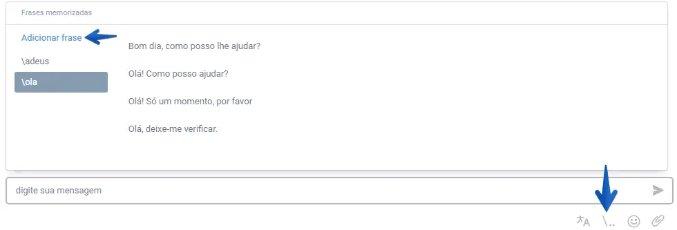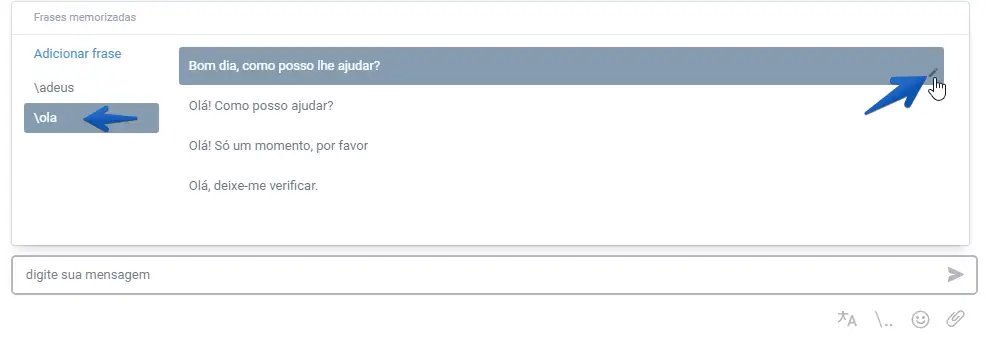 Dicas durante a digitação das mensagens. Essa opção é também chamada de "Frases". Frequentemente os operadores utilizam frases repetidas para enviar aos visitantes. Estas frases são gravadas e mostradas para o operador quando o mesmo está digitando. Estas frases são guardadas somente no computador do operador.