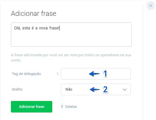 Após clicar para adicionar uma frase, escreva a frase que deseja adicionar, escolha uma tag "/" (1) que será utilizada para encontrar a frase rapidamente durante um chat e, se desejar, escolha um atalho (2) no teclado para também acessar a nova frase rapidamente: