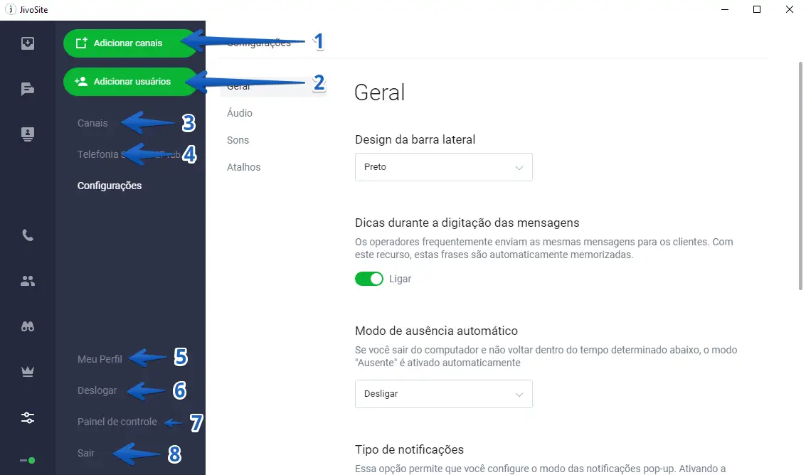 Nessa seção você pode configurar os sons das notificações do seu aplicativo. Pode também ligar o som de notificação para quando um novo visitante entra no seu site.
