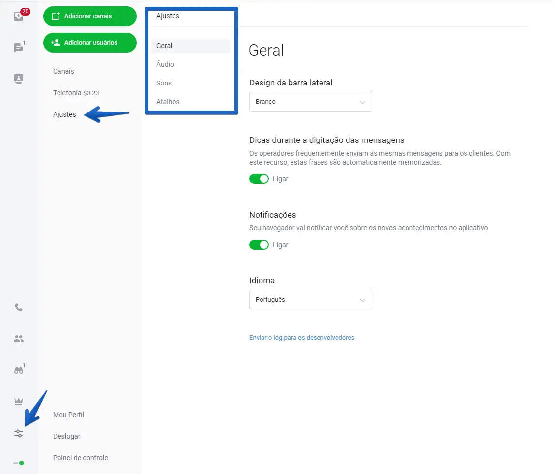 Enviar o log para os desenvolvedores. Essa opção é normalmente utilizada em caso de problemas técnicos. Se você clicar nesse botão, o log do seu aplicativo será enviado para os nossos servidores. O arquivo log será analisado somente se você entrar em contato com a nossa equipe de suporte pelo chat no nosso site, por e-mail em info@jivosite.com ou no nosso fórum.