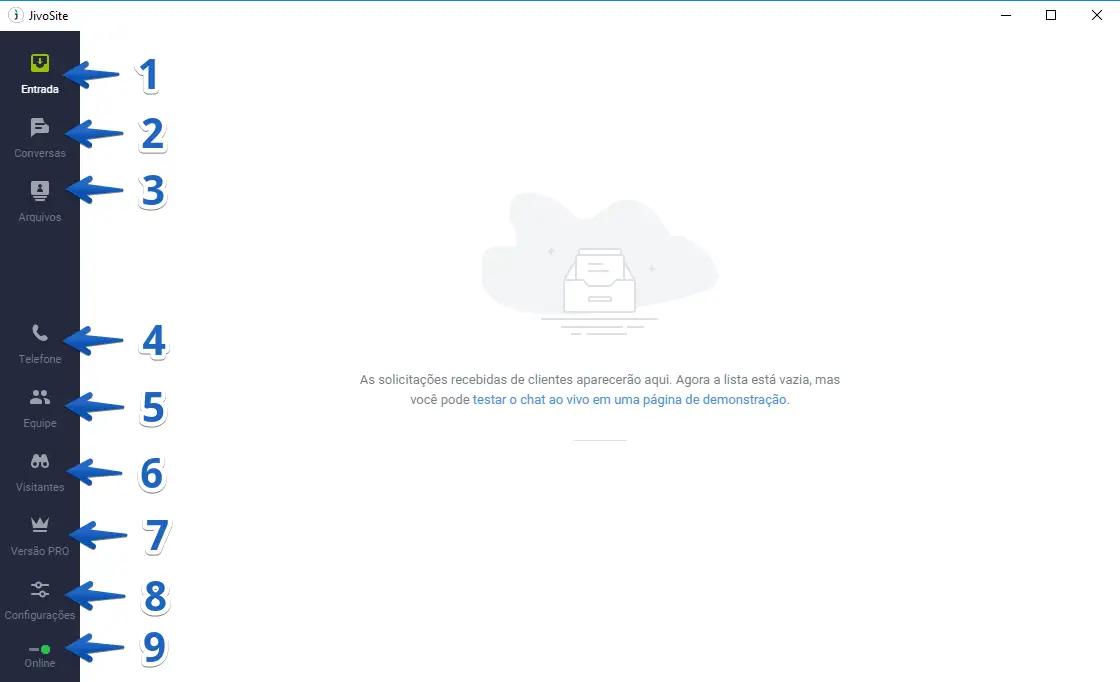 - Entrada. Todos os chats que chegam, antes de serem aceitos, aparecerão nesta aba.