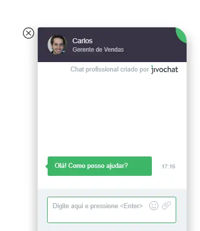 Quando o visitante abre seu site, ele vê a janela do chat. A maioria das conversas são iniciadas por um convite proativo (automático) – a janela do chat sobe com o convite (mensagem escolhida por você) e o visitante pode enviar uma mensagem como resposta.