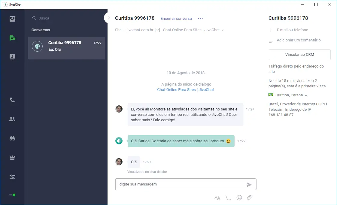 Informações detalhadas do visitante são mostradas no lado direito da conversa: