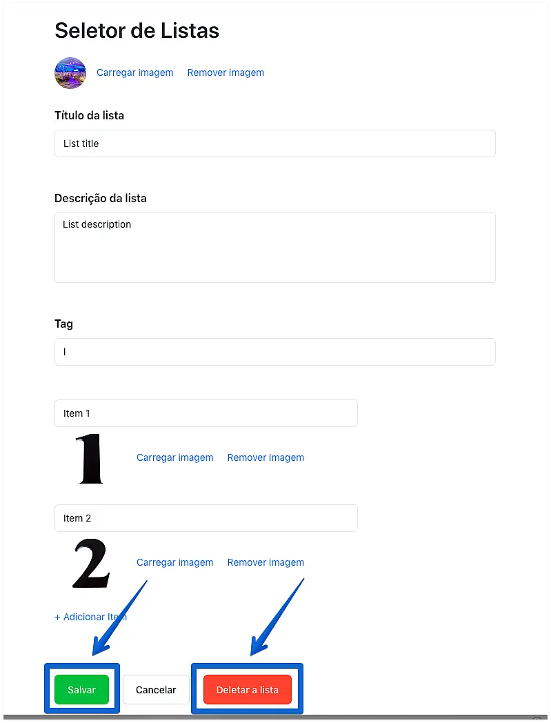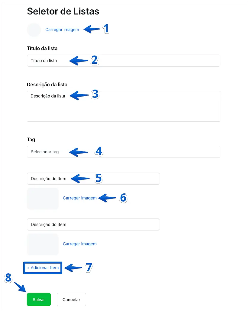 Selecione uma imagem (1; opcional), um título (2), descrição (3), e insira uma tag (4) para que os seus operadores possam identificar o Lista facilmente. Adicione uma descrição (5) e uma imagem (6, opcional) para cada item da sua Lista. Você pode inserir quantos itens desejar em uma única lista. Ao finalizar, clique em "Salvar".