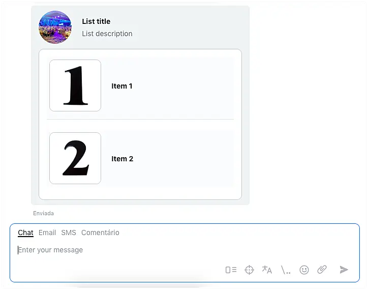 Com a integração do Apple Business Chat, você pode enviar Listas personalizadas para os seus clientes e permitir que eles selecionem um item de sua preferência antes de receber mais detalhes sobre esse item no chat. Assim como as Frases rápidas, as Listas adicionadas a sua conta podem ser utilizadas por todos os seus operadores.