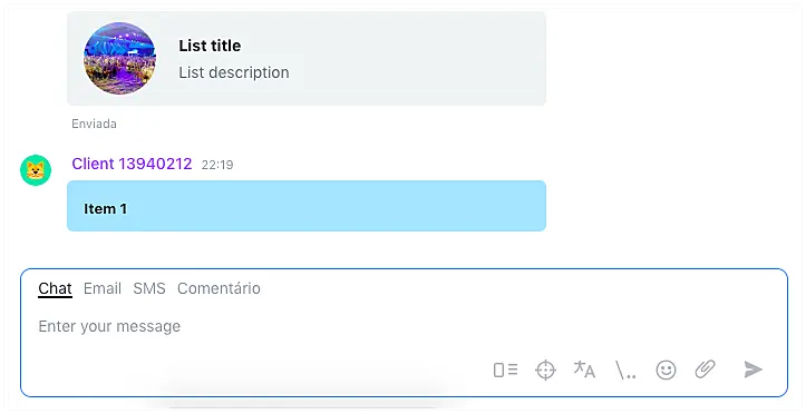 Após criar uma Lista, você poderá enviá-la a qualquer momento durante uma conversa clicando no aba "Lists" e selecionando a Lista que deseja enviar no chat.