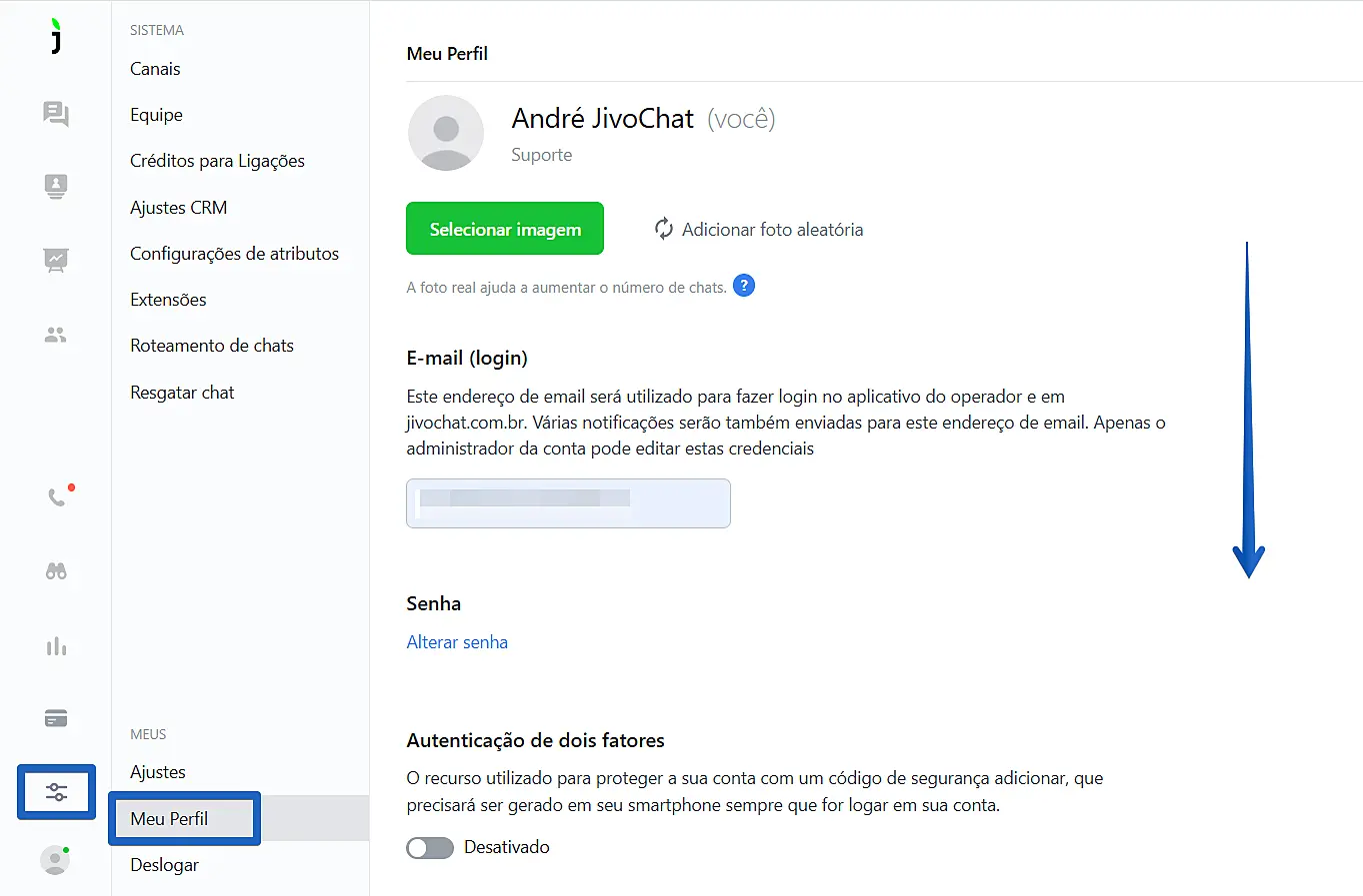 Primeiro, faça o login no seu app Desktop do JivoChat ou no aplicativo Web e acesse o menu "Configurações" > "Meu Perfil".