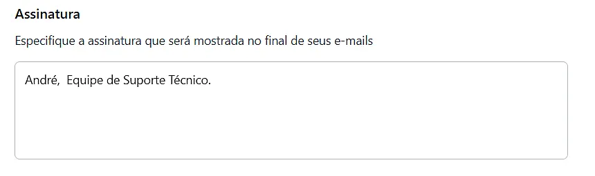 Insira sua assinatura desejada em formato de texto. Após finalizar, basta clicar fora da caixa de edição ou ir para outro menu que as alterações serão salvas automaticamente. Note que somente textos podem ser adicionados na assinatura.