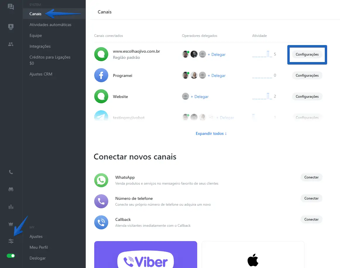 Acesse as Configurações -> Canais -> Configurações (abaixo do canal do site no qual deseja esconder o widget quando não há operadores online):