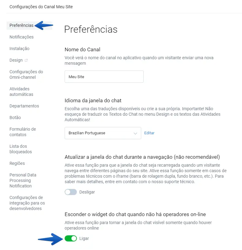 Vá até o menu "Preferências" e ative a opção Esconder o widget do chat quando não há operadores on-line: