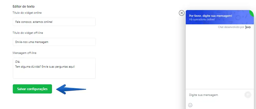 Você pode fazer alterações nos textos, cores, posição e no formato do widget do JivoChat sem precisar editar nenhum código em seu site. Na mesma página, você terá uma pré-visualização de como ficará em seu site. Após salvar as configurações, todas as alterações aparecerão em seu site imediatamente.