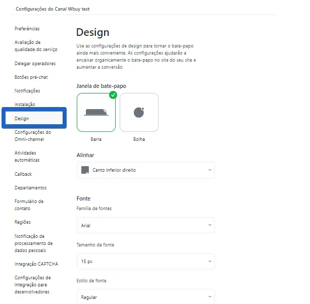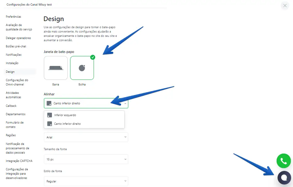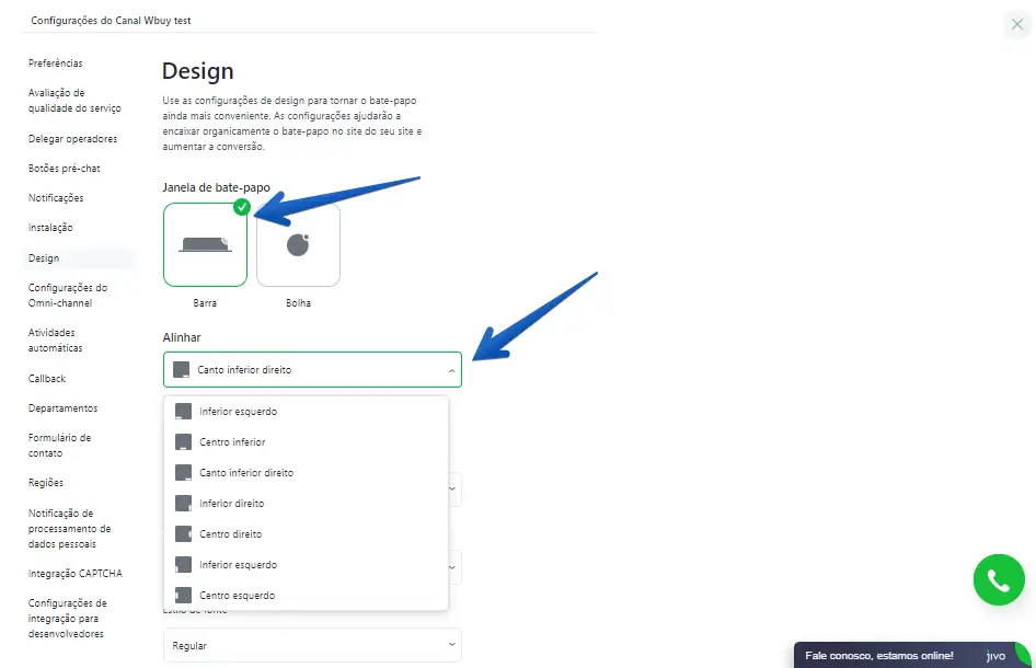 Talvez a configuração mais importante além da paleta de cores seja a posição do botão e da janela de bate-papo, ou melhor, onde exatamente o chat estará localizado em seu site.