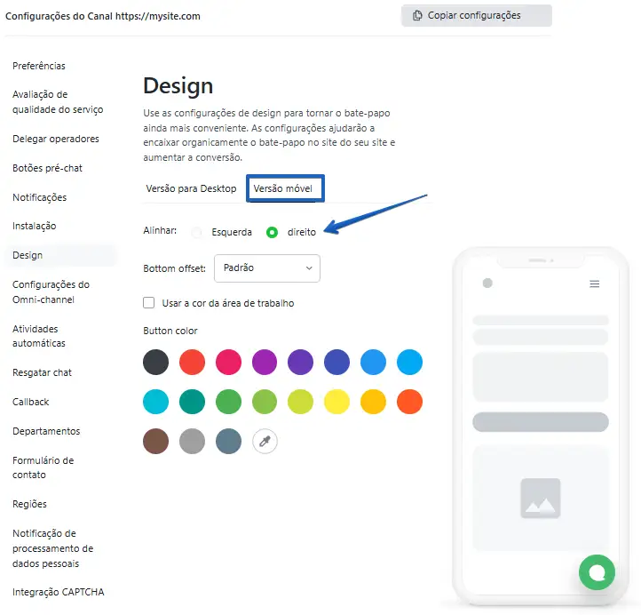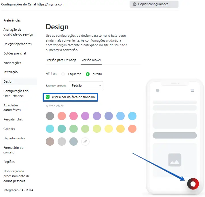 Também é possível customizar a aparência do chat na versão mobile do seu site. Você pode escolher a cor do botão de bate-papo entre as cores sugeridas ou personalizar sua própria cor. Você pode marcar a opção "Usar cor da área de trabalho" para usar as mesmas cores do widget da área de trabalho. Além disso, você pode escolher de qual lado ficará o botão de chat: à direita ou à esquerda.