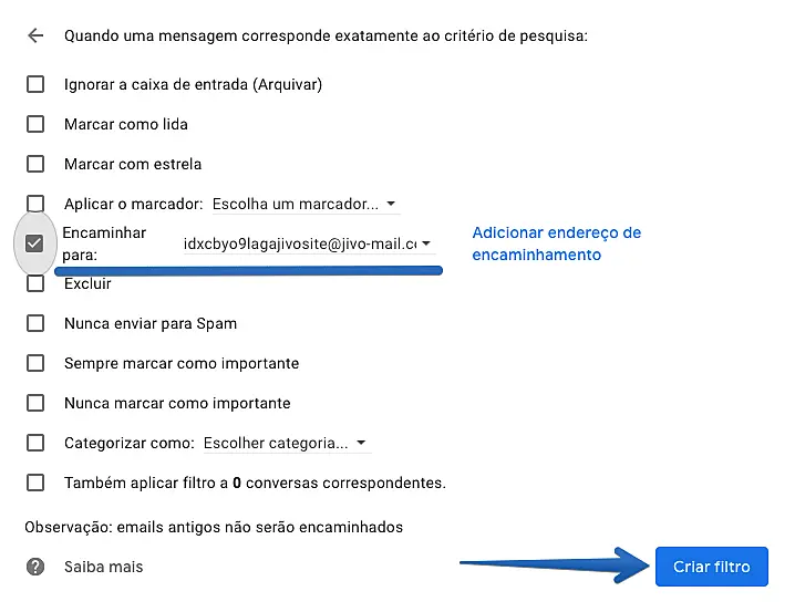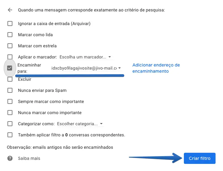 3. Selecione a ação que deve ser realizada quando você receber e-mails com os critérios definidos - "Encaminhar para: (selecione o email de encaminhamento da JivoChat)" e clique em "Criar filtro".