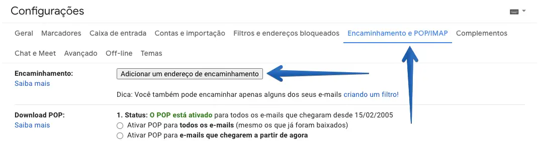 2. Clique na opção "Encaminhamento e POP/IMAP" e depois clique em "Adicionar um endereço de encaminhamento".