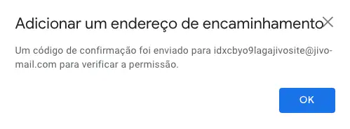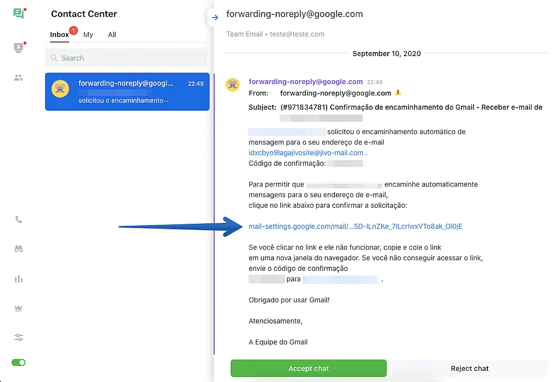 5. Verifique o seu aplicativo do JivoChat, você deve receber uma nova mensagem do Google contendo o link para confirmar o encaminhamento de seu e-mail. Clique no link e, em seguida, clique em "Confirmar".