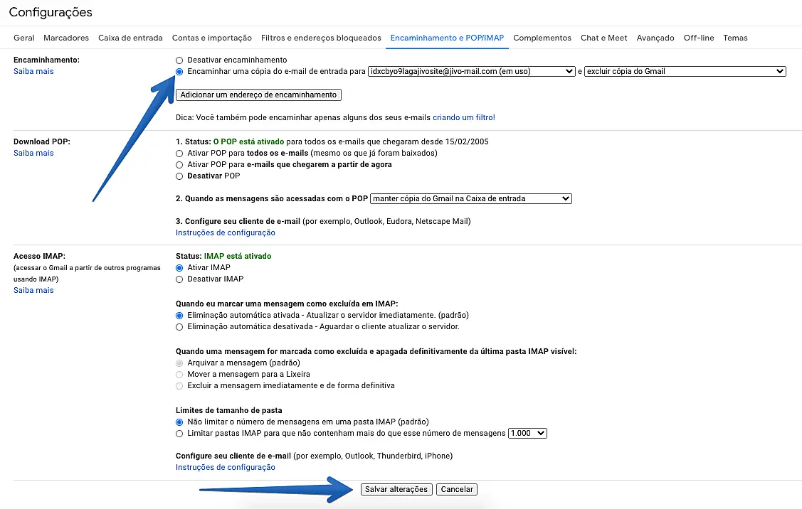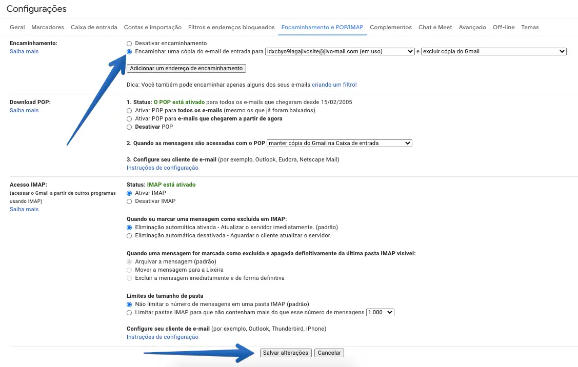 6. Para finalizar, selecione a opção de encaminhar uma cópia do email de entrada para o email de redirecionamento da JivoChat e clique em "Salvar alterações".