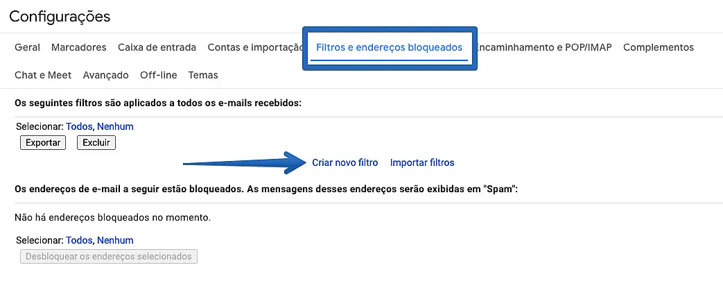 1. No Gmail, clique em "Configurações" > "Ver todas as configurações" > "Filtros e endereços bloqueados" e clique em "Criar novo filtro".