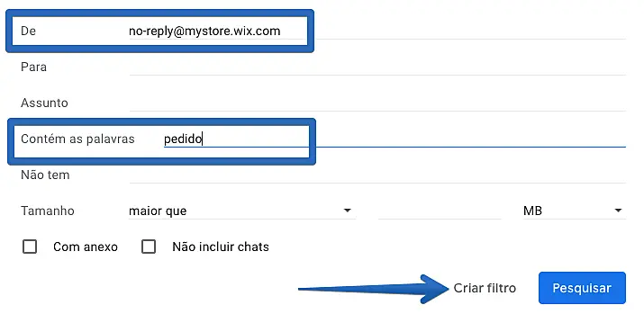 Caso não queira enviar todos os e-mails recebidos para a JivoChat, você pode criar filtros. Vamos adicionar um filtro para e-mails contendo a palavra "pedido" como exemplo.