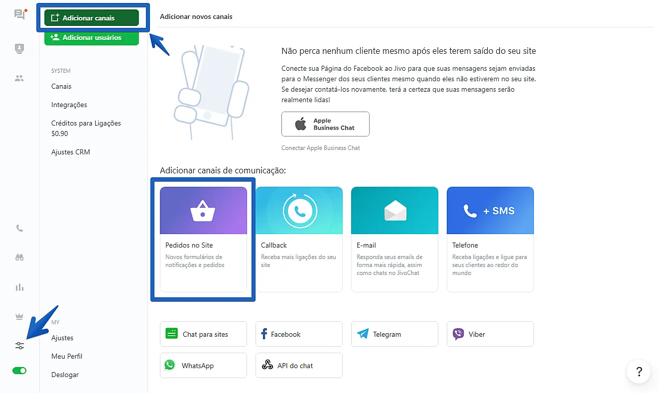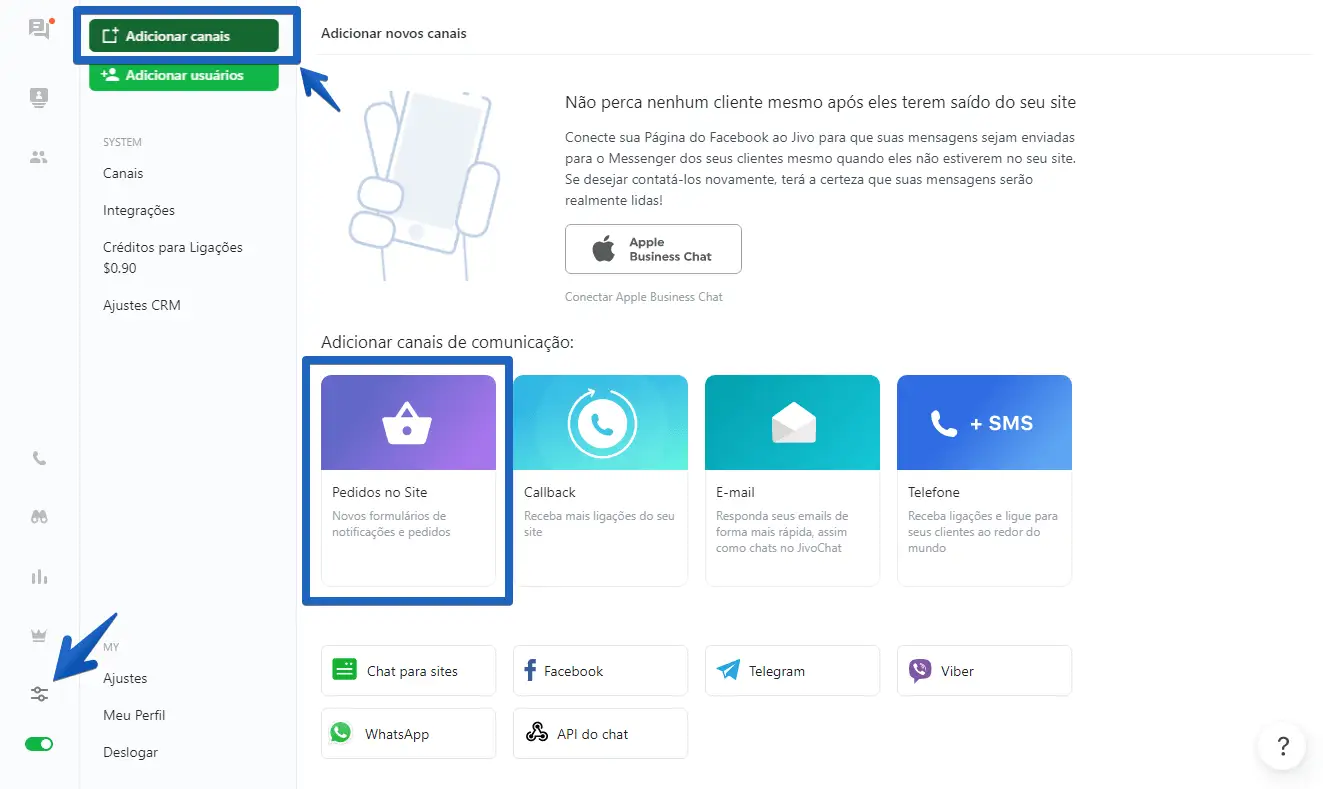 1. Primeiramente, você deverá gerar seu próprio email no JivoChat para receber pedidos no app. Para fazer isso, acesse o aplicativo web do JivoChat ou um de nossos apps Desktop e siga para "Configurações" -> "Adicionar canais" -> "Pedidos no Site".