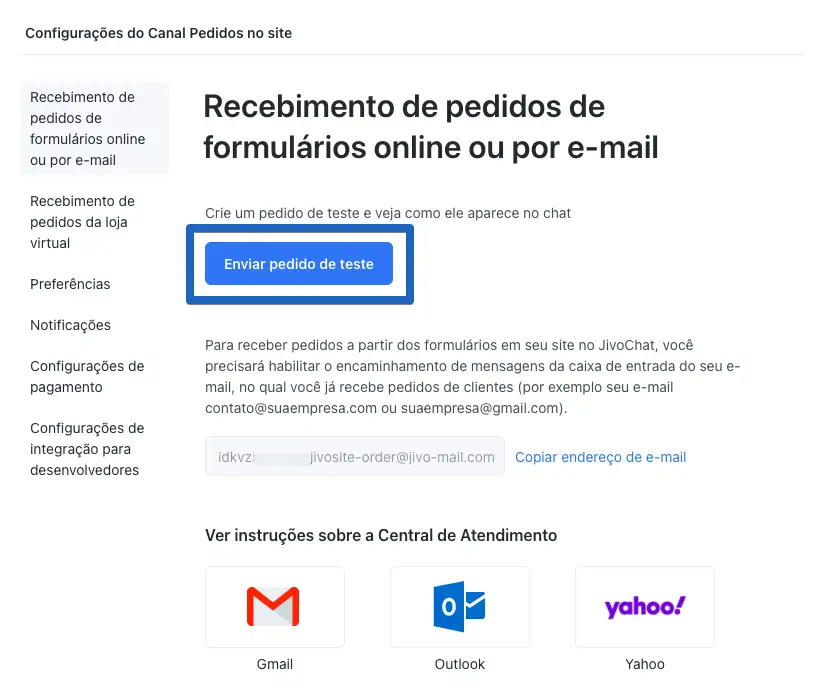 6. Você será redirecionado(a) novamente ao menu de "Configurações" do canal criado. Agora é só copiar o endereço de e-mail gerado pelo JivoChat e seguir para o próximo passo.