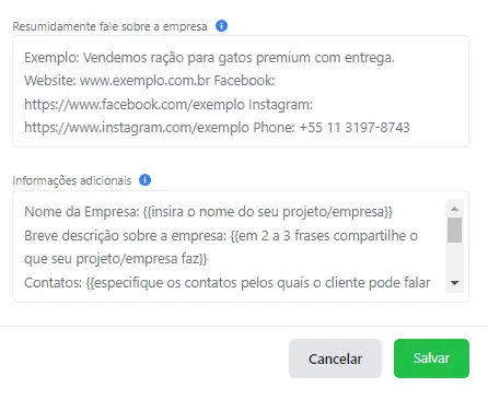 - Resumo sobre a empresa - neste campo, conte-nos o que a empresa faz, indique contatos, links de redes sociais, website (siga o exemplo da dica no formulário). Lembre-se que é com base neste campo que o modelo de inteligência artificial selecionará as respostas.