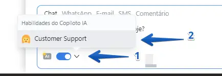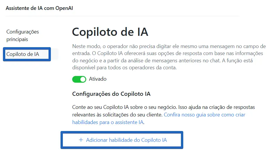 Agora habilite o "Copiloto IA para operadores" e em seguida, clique na opção "Adicionar habilidade do copiloto IA"