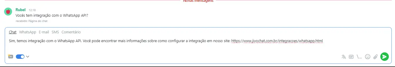 O Autopilot preparará uma resposta automaticamente para a próxima mensagem do cliente, como no exemplo abaixo. O operador poderá verificar a resposta antes de enviá-la: